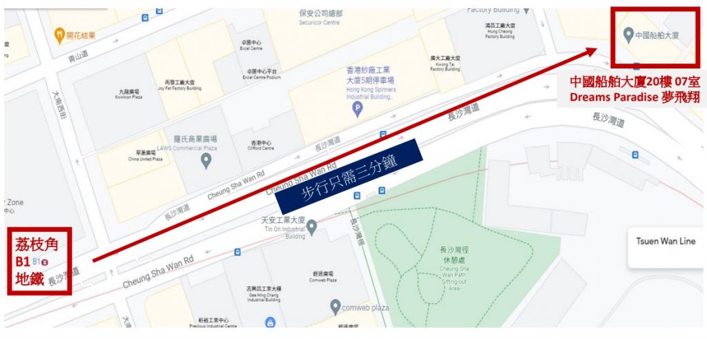 九龍長沙灣道650號, 中國船舶大廈20樓07室 (荔枝角地鐵站B1出口)。